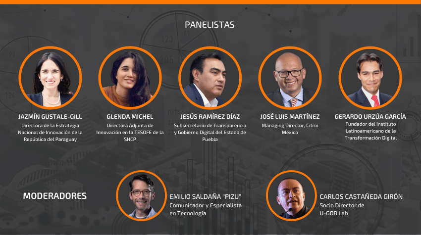 Jazmín Gustale-Gil, Directora de la Estrategia Nacional de Innovación de la República de Paraguay; Glenda Michel, Directora Adjunta de Innovación de la Tesofe de la Secretaría de Hacienda y Crédito Público; Jesús Ramírez Díaz, Subsecretario de Transparencia y Gobierno Digital del Estado de Puebla; José Luis Martínez, Managing Director de Citrix México; y Gerardo Urzúa García, Fundador del Instituto Latinoamericano de la Transformación Digital, son los expertos que formarán parte de este panel moderado por Emilio Saldaña “Pizu”, Comunicador y especialista en tecnología, y Carlos Castañeda Girón, Socio Director de u-GOB Lab.
