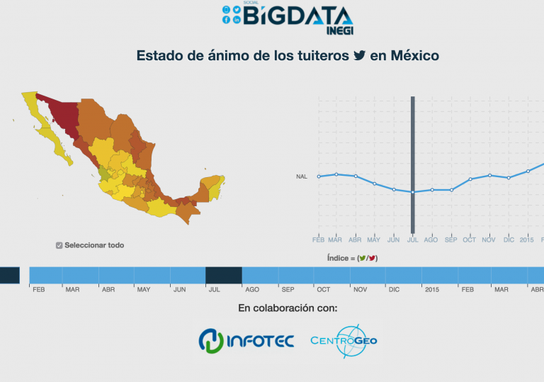 Inegi en conjunto con Infotec, Centro Geo y el apoyo de Tec Milenio realizó un análisis del estado de ánimo de los tuiteros en México de febrero de 2014 a mayo de 2015. Esta información está presentada de manera geográfica y temporal en el sitio del Inegi. A continuación presentamos un extracto de la nota metodológica de cómo se clasificaron los mensajes de la red social y cómo se llegó al resultado. El documento original se encuentra disponible en éste vínculo (documento en PDF).