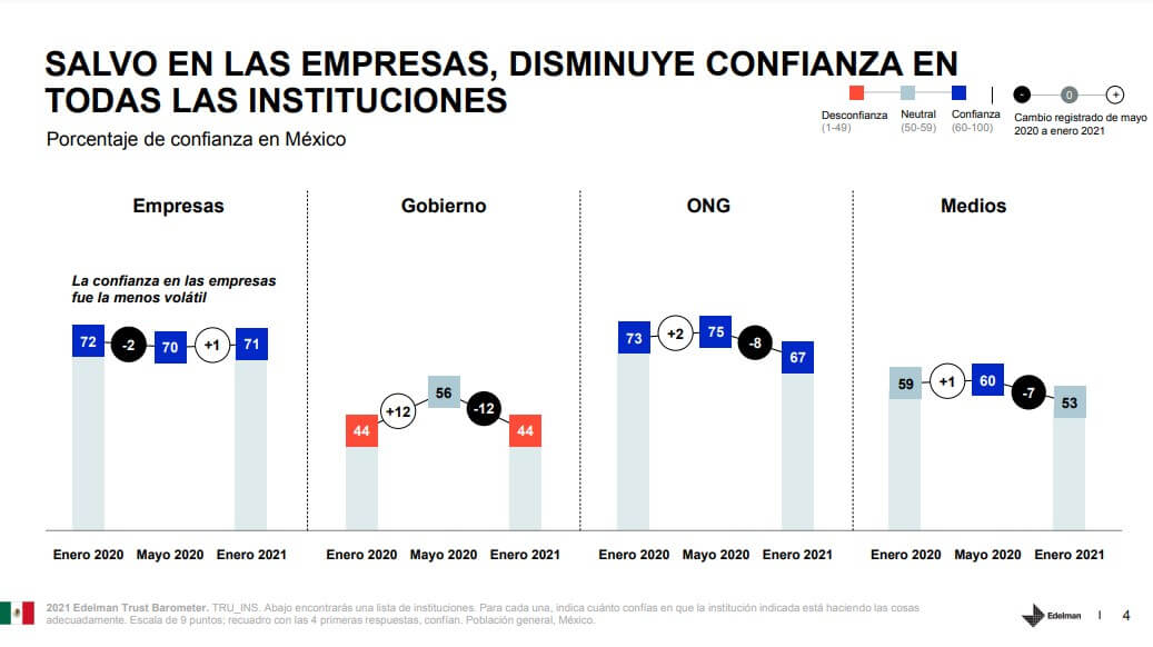 Aunado a lo anterior, el clima de desconfianza parece incrementarse en el contexto de incertidumbre generado por la pandemia de COVID-19. Un estudio realizado por la agencia Edelman, que desde hace 21 años mide la confianza de los ciudadanos en las instituciones, revela en sus resultados publicados este mismo año que, desde mayo de 2020 y hasta febrero de 2021, el nivel de confianza de los mexicanos en el gobierno disminuyó 12 puntos, mientras que las empresas se convirtieron en la única institución que se considera tanto ética como competente en el país.