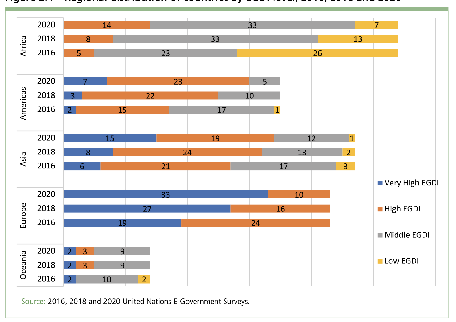 El avance de los países ha sido importante y, tal como lo muestran las gráficas, nuestro desempeño como región ha mejorado. Varios países (cuatro para ser exactos) han pasado a la categoría más alta de este indicador, Very High EGDI, y tres se han unido desde la categoría intermedia a la alta, High EGDI.