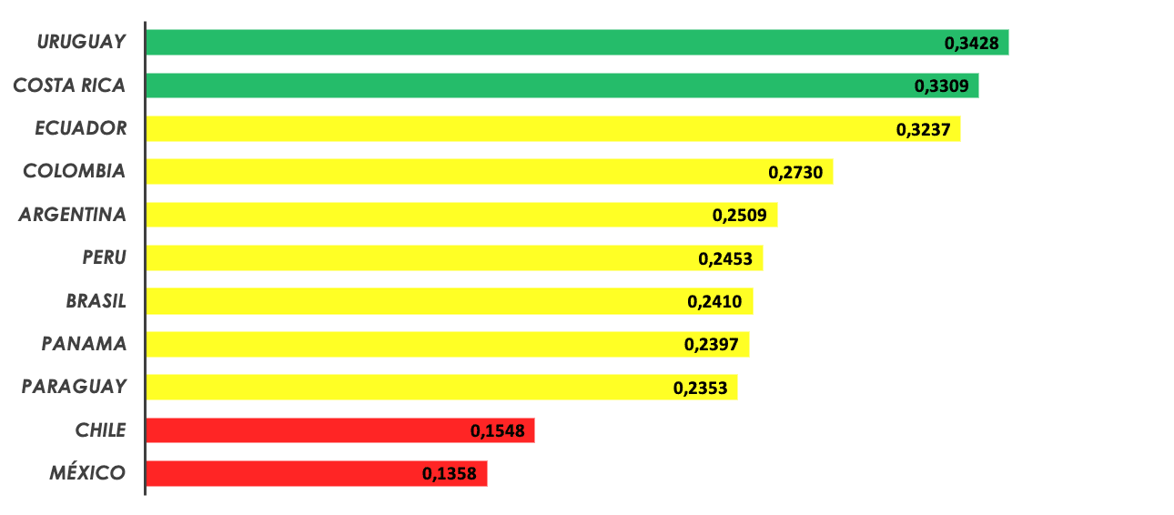 Así pues, en este último estudio, vemos pocos cambios de evaluaciones anteriores. El liderazgo lo sigue manteniendo Uruguay y los más rezagados en términos de trayectoria son Chile y México.