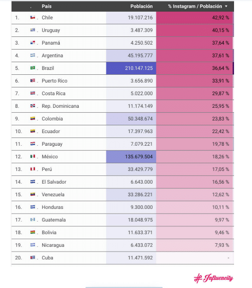En esta última hay presencia de datos curiosos, por ejemplo, que Chile es el país que más usuarios en Instagram tiene, es decir, el 42.92% de su población son usuarios en la red social. Le sigue Uruguay con un 40.15% y Panamá con 37.64%. Argentina, Brasil y Puerto Rico son los siguientes en la tabla.