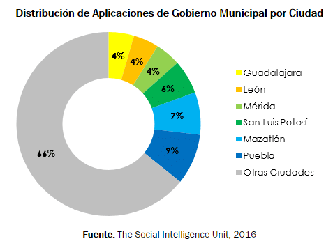 La muestra conformada por 48 aplicaciones (67 registros) emitidas por gobiernos de municipios y delegaciones muestra que en Puebla, Mazatlán, San Luis Potosí, Mérida, León y Guadalajara se concentra el 34% de las mismas.